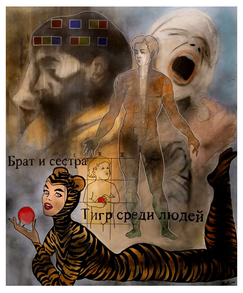 "Брат и сестра и Тигр среди людей" (Brüderlein und Schwesterlein und der Tiger unter den Menschen) Oil on canvas. 120 x 100 cm. 2019 |